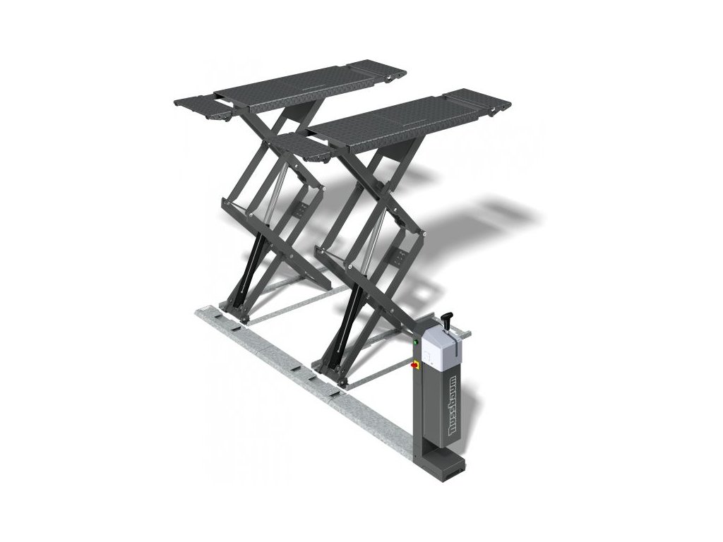 Dvojitý nůžkový zvedák s přímým připojením k parapetu. Kompaktní pod olejovou jednotkou s ovládací pákou pro citlivé a elektrické spouštění. Extrémně plochý design. Plně hydraulický systém bez elektrických a pneumatických součástí na zvedáku rampy s výsuvem na obou stranách a ergonomicky uzamykatelným a odemykatelným sklopným mechanismem
